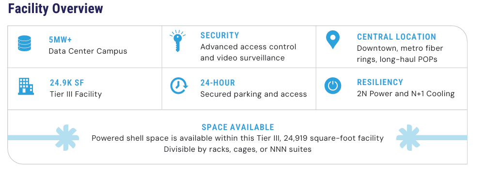 Customers can deploy infrastructure using single racks, cages, dedicated suites, or powered shell space within CENTRA’s 24,919-square-foot Tier III campus.