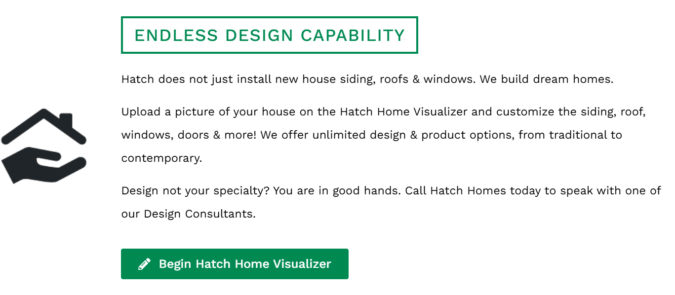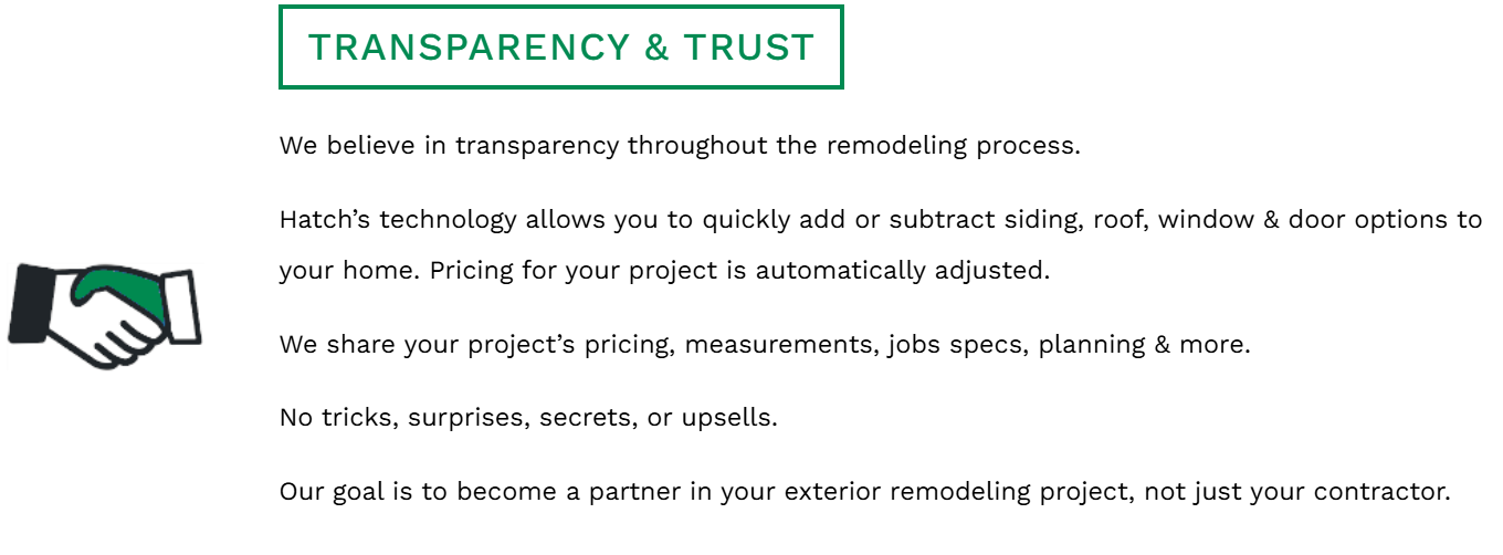 Hatch Homes is an exterior remodeling company that specializes in the installation and replacement of James Hardie Fiber Cement Siding, Vinyl Siding, Stone Veneer Siding, Roofs, Windows, Doors, Gutters, Shutters & More. Hatch Homes uses industry-leading technology and expertise to offer our homeowners multiple product options, unlimited design choices, and high-end quality while keeping our prices low & affordable. Our company goal is to remove the stress homeowners experience during the remodeling process by providing transparent pricing, professional communication, and convenient estimates. Hatch makes home remodeling easy!